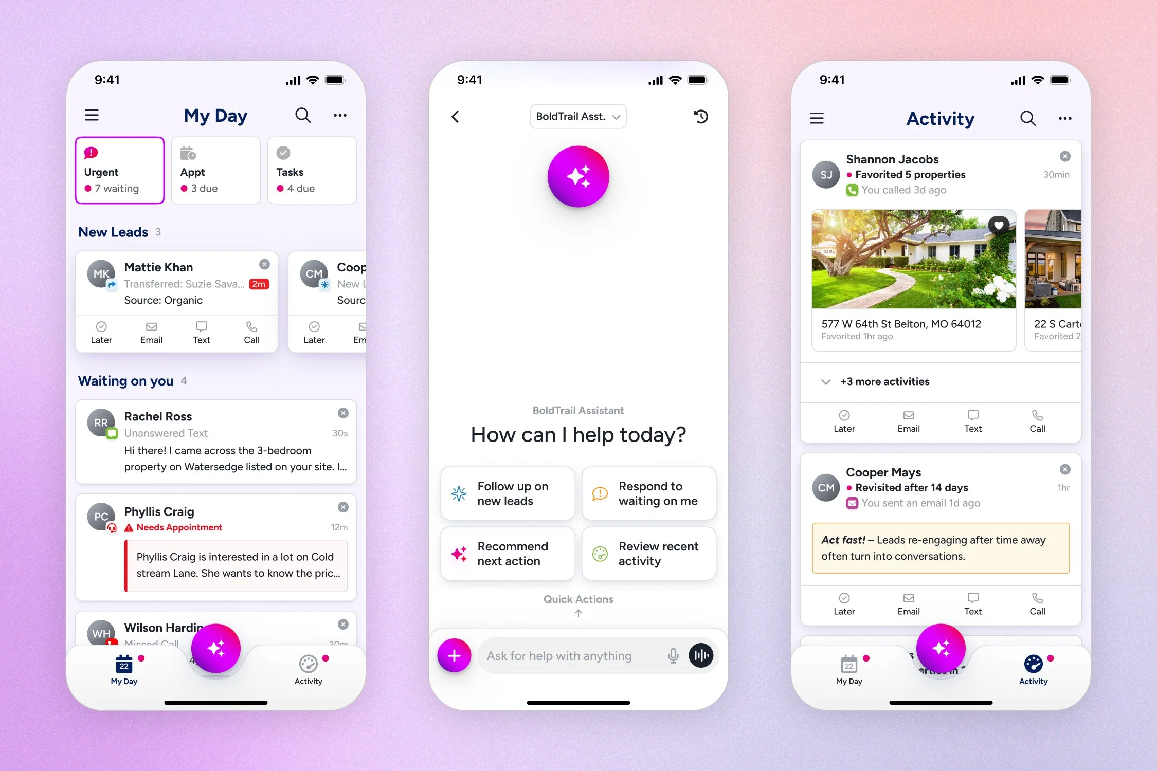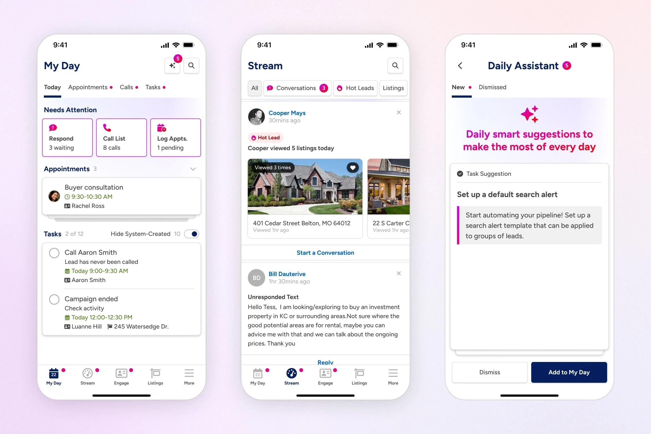Streams is the mobile companion app to BoldTrail, a feature-rich CRM for real estate agents and brokerages. This streamlined, AI-powered app helps agents on-the-go stay on top of client conversations by bringing their most urgent tasks and insights into focus throughout their day.